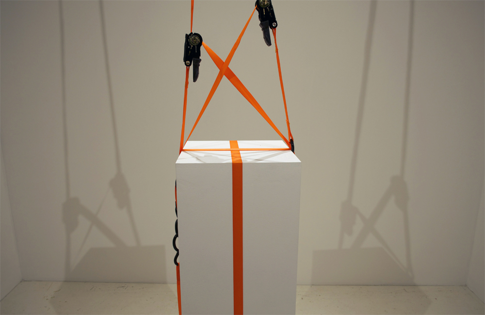 My concern was how to activate the pedestal in order to elevate it’s status to primary object rather than secondary. Using ratchet straps, a handy art moving tool, the pedestal was bound and I increased the potential energy through labor, releasing it to become art.