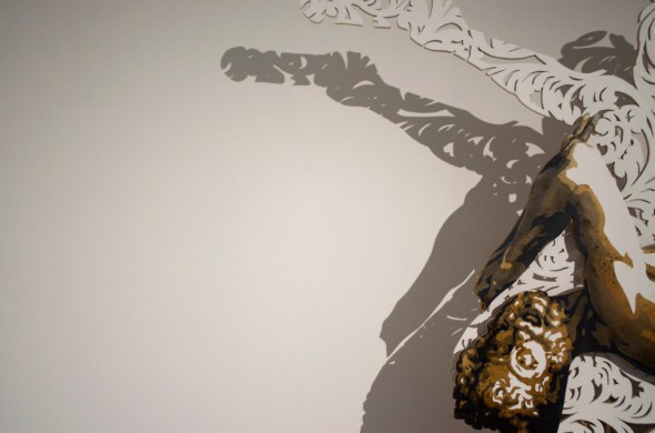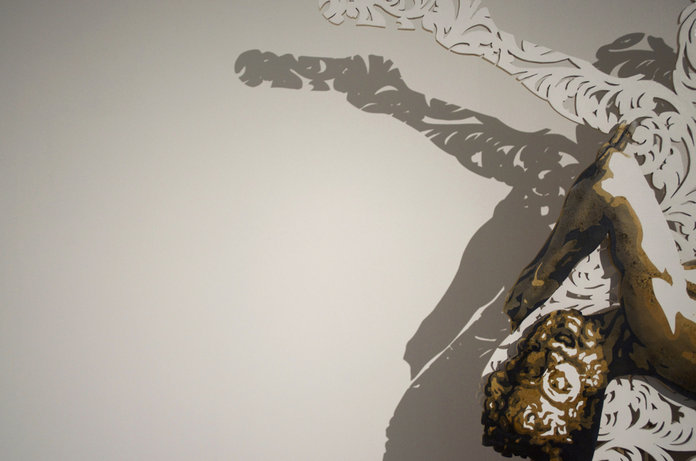 On a more formal note, I have tried to pull from the power, mastery, and seduction of such a well crafted sculpture, further confusing the issue of beautified, culturally permissable violence by applying it to Southern principles of romance and violence. The figure of Hercules has been converted into a pattern that I created based upon the decoratively engraved breach of a rifle. This both grounds the pattern in a tradition of beautifying weapons and violence while altering the brutality of the figure. Not that it is necessarily lessens brutality, but it somehow subverts it, bringing to mind the 1908 Adolf Loos phrase “Ornament is a crime…” (I think the full quote is “Ornament is a crime against the national economy,” which is even more odd, but I need to double check that.)