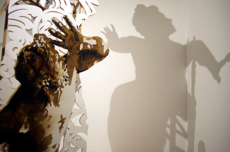 Without trying to over-think or overstate my intent –as is my want– while developing Complicit I was thinking about Western methods of icon representation, namely billboards and the utilitarian, schematic and architectural systems we use to present imagery. Comparing this to the often propagandistic, large scale sculpture of the late Renaissance I was taken with the flat frontal quality of modern imagery. In an effort to confound this a bit I pulled three separate views of the original “Rape of Sabine” sculpture from the internet, isolating each figure from a different image and angle. This facet of the sculpture engages with the ways of seeing influenced by online imagery and academia, i.e. flat popular imagery used to partially describe three dimensional objects.