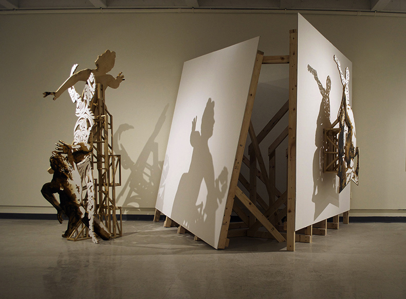 Drawing his inspiration from Giambologna’s late Renaissance works “Rape of the Sabine Women” and “Hercules Fighting the Centaur Nessus” in Florence, Richards new works present flattened versions of complex sculptures held aloft by a wooden network of scaffolding reminiscent of drive-in movie screens, billboards, and towers lining the local highways. Dwelling on the uniquely conflicted relationship between victim and oppressor, utility and language, the works reflect theatrical imported propaganda as subjected to locality.