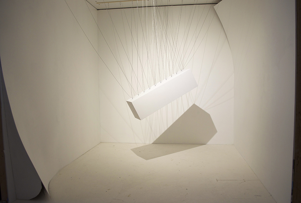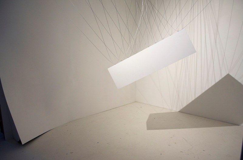 As part of the ongoing First Friday Exhibition series The Cube presents Suspension, an installation by Ryder Richards. Suspending an art pedestal from a series of cables in the middle of the gallery the installation offers the tools of art display as inherently graceful, formal, and full of their own gravity and tension. the installation draws inspiration from Calatrava bridges and the texts of “Warped Space: Art, architecture and anxiety in modern culture” by Anthony Vidler. Considered from a different perspective, Richards’ installation evokes a ritualized relation to the pedestal as body.