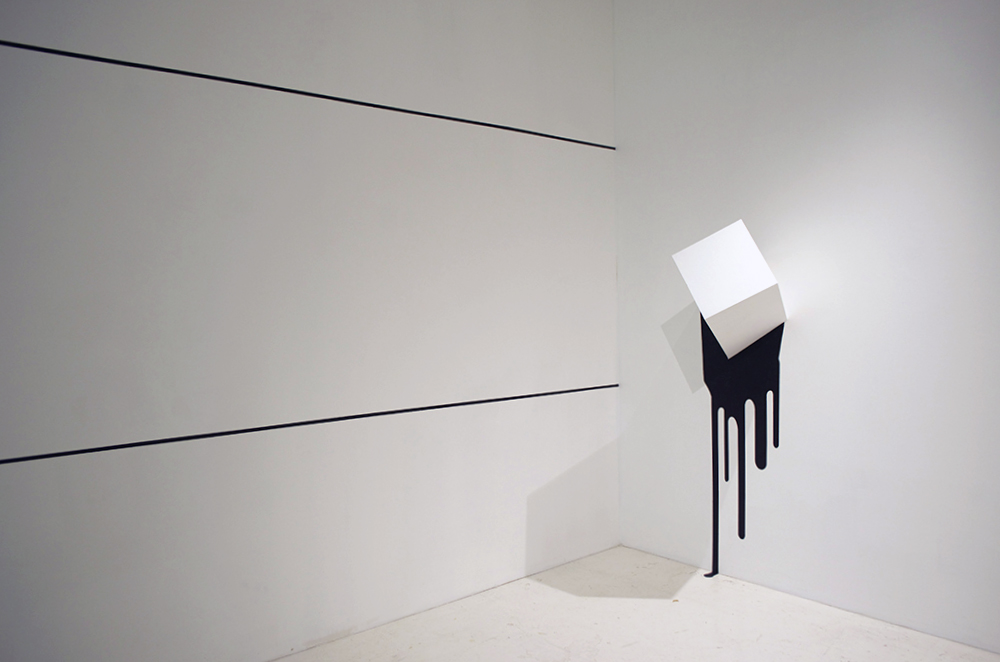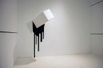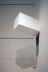 As part of my ongoing use of the Cube as an installation platform I have become increasingly reliant on the pedestal as the object of focus within the cube. Often the pedestal is tortured in some way: bound or suspended. In this version Ionic I jams the pedestal through the rear wall of The Cube, questioning the integrity of The Cube as sacrosaint space. By breaching the walls the pedestal has attempted emancipation, yet even the violence of this action is easily altered into a mediated action within the context of The Cube.