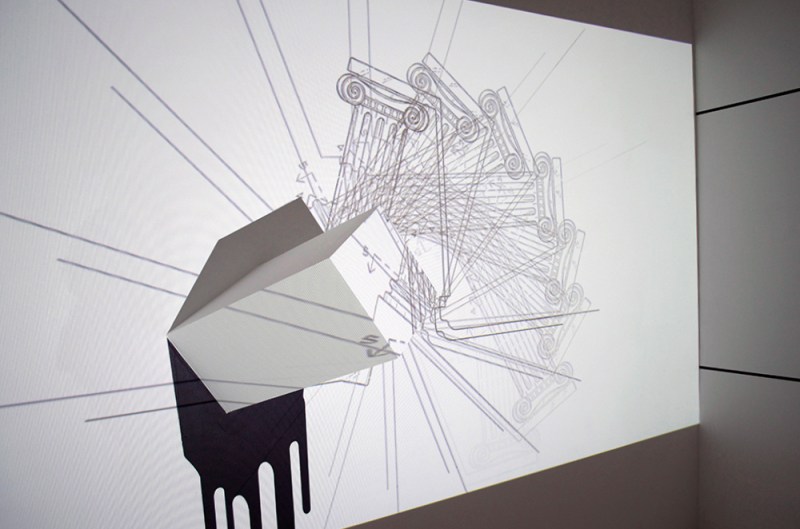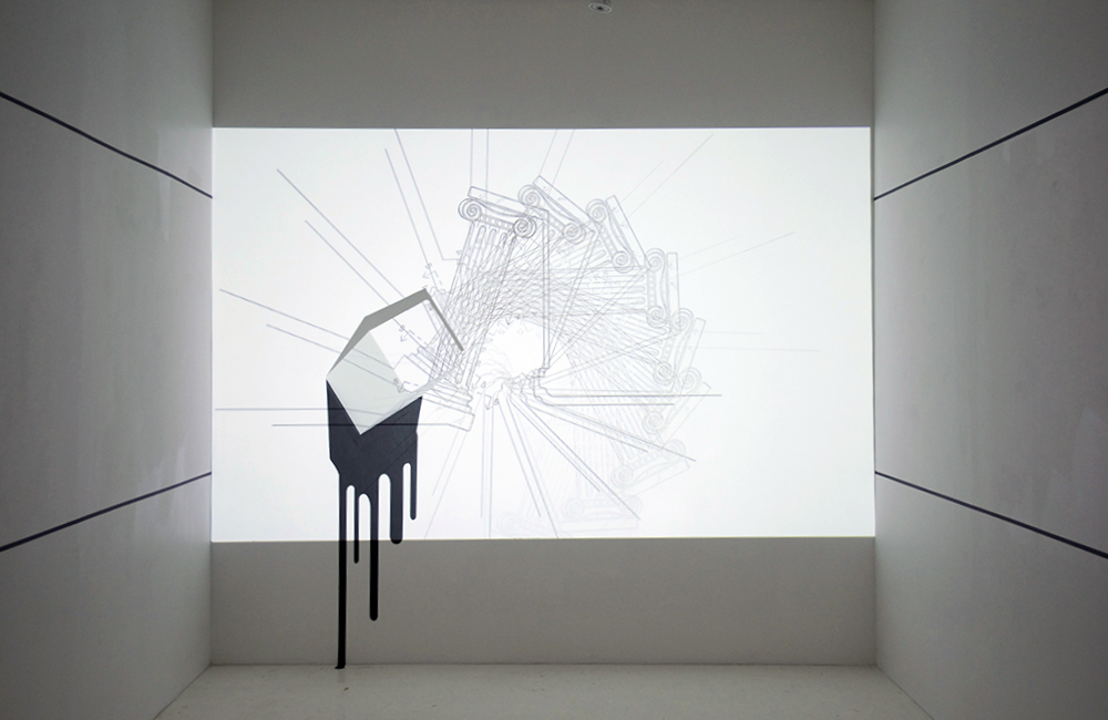 In Ionic II there is further indictment of the pedestal by referencing the classical ionic column as a diagram of collapse. By projecting the continual flipping of the ionic column onto the site of the pedestal breach there is a reference to the failure of theory where it is interrupted by actualization or emotion.