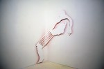 By cutting the evenly spaced ‘slits’ in the extended form the shadow becomes active by pulling away from and returning to the form while it creates a rippled effect of movement. The other ‘op-art’ trick is painting the back a vibrant color, such as pink or orange, in order to cast a reflective glow onto the wall around the figure. A powerful way to embue spirit to an object, which I have used on several pieces.