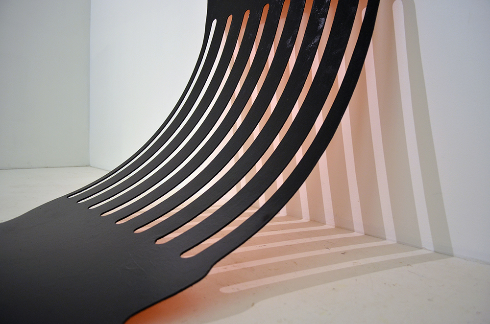 By cutting the evenly spaced ‘slits’ in the extended form the shadow becomes active by pulling away from and returning to the form while it creates a rippled effect of movement. The other ‘op-art’ trick is painting the back a vibrant color, such as pink or orange, in order to cast a reflective glow onto the wall around the figure. A powerful way to embue spirit to an object, which I have used on several pieces.